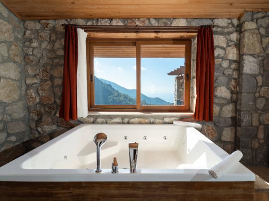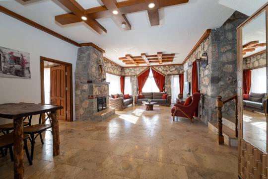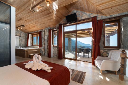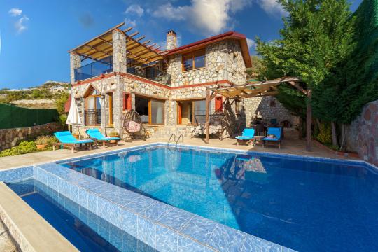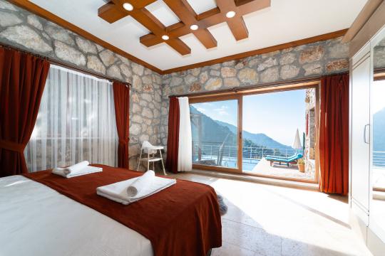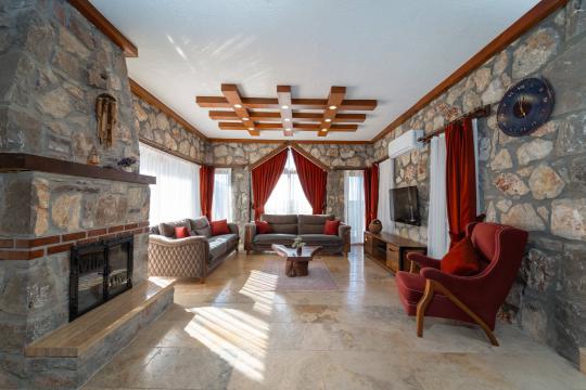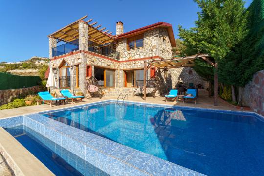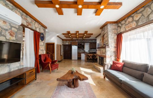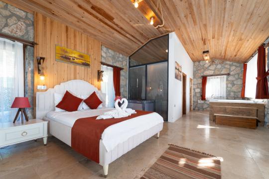 Taş ve ahşap detayların ön planda tutulduğu modern mimariye sahip olan villamızda 2 adet yatak odası ve 2 adet WC-Duş bulunmaktadır. Birinci yatak odasında 1 adet çift kişilik yatak, jakuzi, ebeveyn banyosu, klima ve TV bulunurken, ikinci yatak odasında 2 adet tek kişilik yatak yer almaktadır. Ortak alanda açık mutfak-salon, WC-Duş, klima ve TV bulunmaktadır.