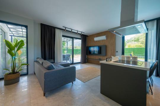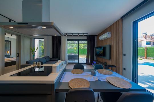 Salon: Konforlu oturma grubu, LCD ekran akıllı TV, uydu alıcı, klima ve havuz terasına çıkış bulunmaktadır.