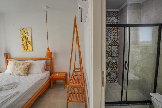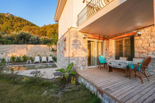 Fethiye Faralya mevkiinde bulunan villa 3 yatak odasıyla 6 kişilik konaklama kapasitesi sunmaktadır. Korunaklı havuz ve bahçe alanı mevcuttur. Balayı çiftleri ve çekirdek aileler için uygundur. Bir yatak odasında çekyat mevcuttur bu sebeple 6 kişi konaklama kapasitesine uygundur.
