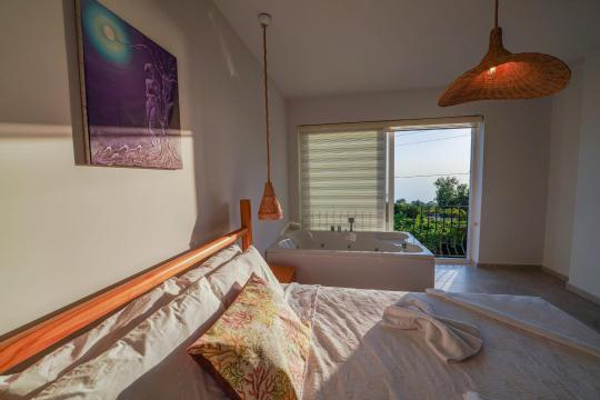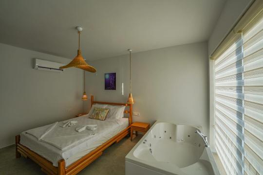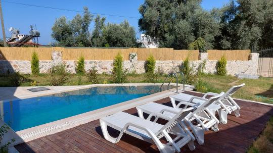 Geniş havuz ve bahçe alanına sahip villada, kapasiteye uygun oturma alanı, şezlong takımı, havuz terasına açılan konforlu oturma odası, ihtiyaçlarınızı karşılayacak donanıma sahip şık mutfağı bulunmaktadır. Bir yatak odasında çift kişilik yatak ,jakuzi ve ebeveyn banyosu; ikici yatak odasın da çift kişilik yatak mevcuttur. Doğa içinde, huzurlu sakin bir tatil vaadeden, bulunduğu konumdan esinlenilen detaylara sahip olan villada, keyifli bir tatil deneyimlemeniz için her şey düşünülmüştür.