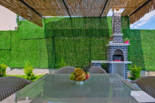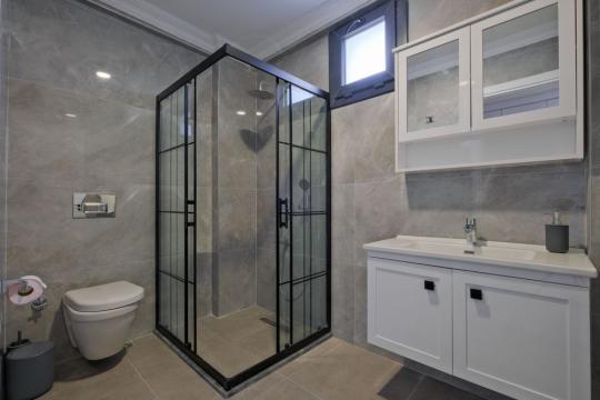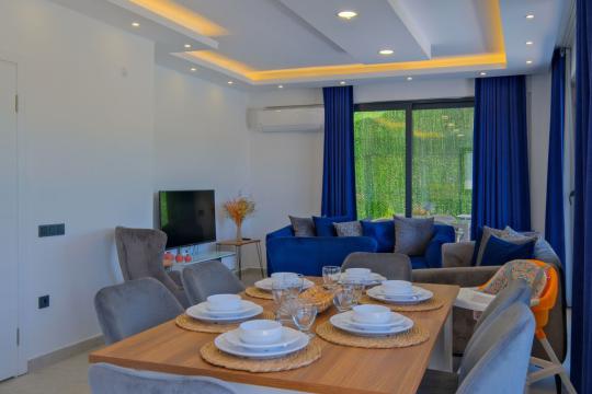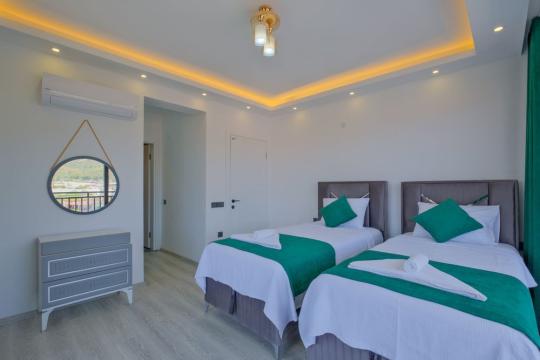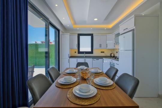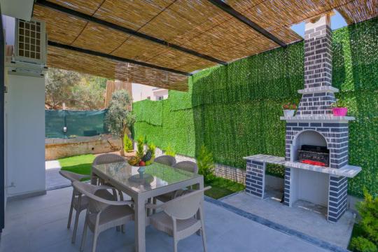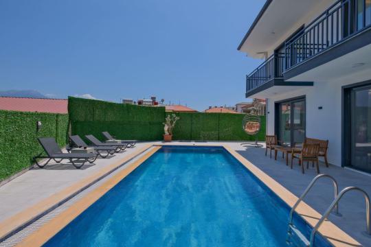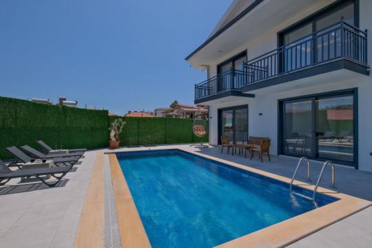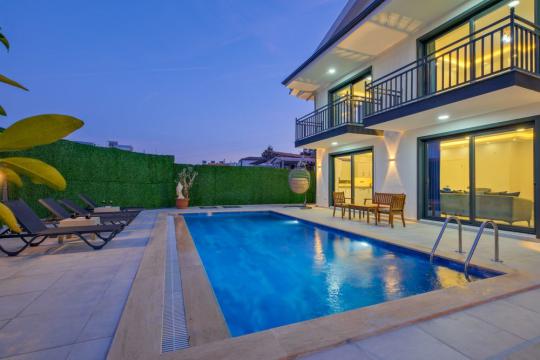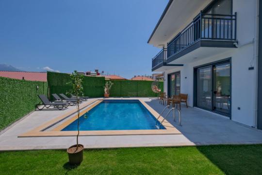 Merkezi konumu sayesinde tercihlerin başında gelen villa, oldukça ferah ve geniş bahçe alanında kapasiteye uygun şezlong takımı, oturma grubu, salıncak ve barbekü alanına sahiptir. Havuz terasına açılan zevkle döşenmiş konforlu oturma odası ve tam donanımlı mutfağı, her iki yatak odasında da çift kişilik yatak ebeveyn banyosu; üçüncü yatak odasında iki tek kişilik yatak ve ebeveyn banyosu bulunmaktadır. İç mekan yapısı ve donanımları da en az dış mekan kadar ferah, modern ve konforunuz ön planda tutularak oluşturulmuştur.