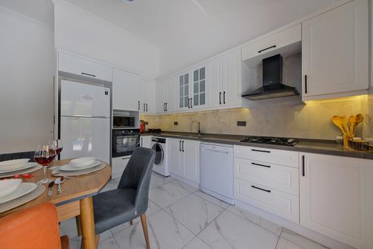 Mutfak : Mutfak bölümünde ise buzdolabı, bulaşık makinesi, çamaşır makinesi, fırın, mikrodalga fırın, çay makinesi, 4’lü ocak seti, mutfak araç gereçleri(tabak&bardaklar, tencere&tavalar vb.) ve yemek masası bulunur.