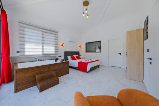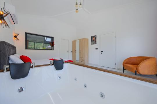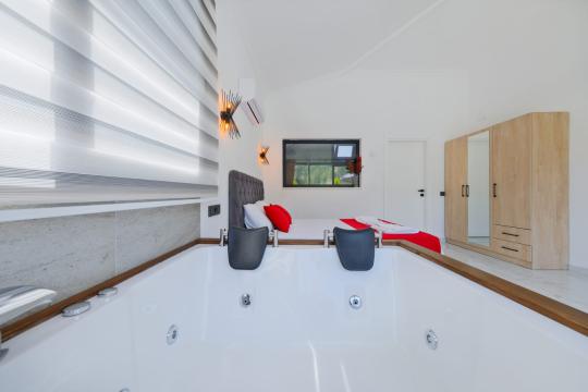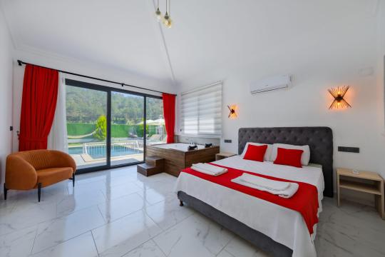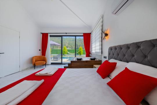 1. Yatak Odası : 1 adet çift kişilik yatak, komodin, elbise dolabı, berjer, jakuzi, klima, WC&banyo, havuz terasına çıkış bulunmaktadır.