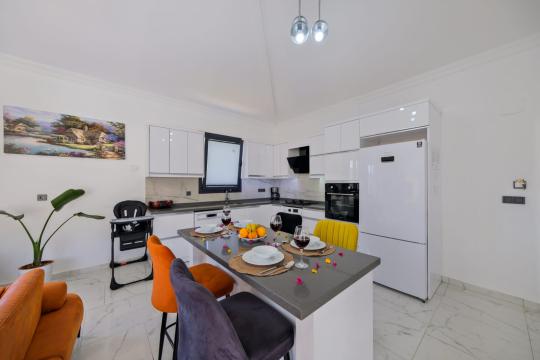 Mutfak : Amerikan ada mutfak içerinde, buzdolabı, bulaşık makinesi, çamaşır makinesi, ankastre fırın, 4’lü ocak, çaycı, tost makinesi, mutfak araç gereçleri ( tencere, tava, bardak, çatal&bıçak, yemek takımı vb.) bulunmaktadır. Havuz başına çıkış bulunmaktadır.