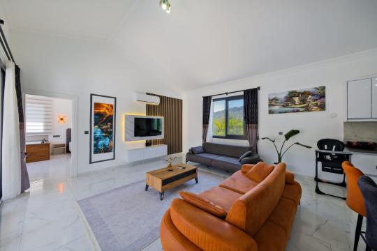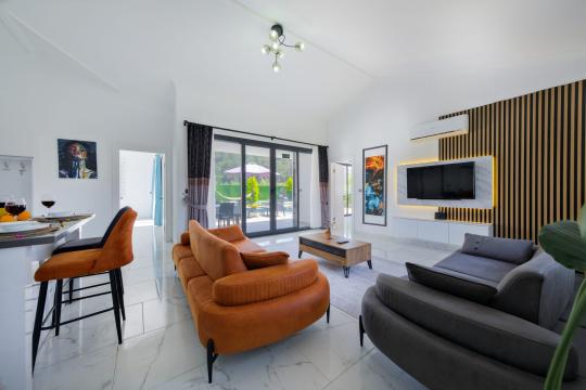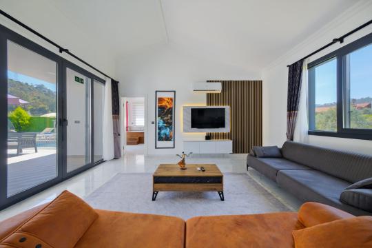 Salon : Konforlu oturma grubu, orta sehpa, TV, klima, havuz terasına çıkış bulunmaktadır.