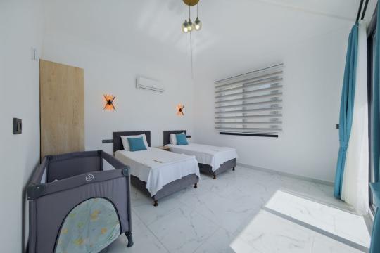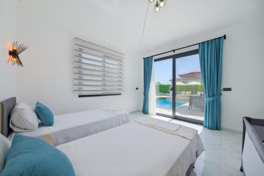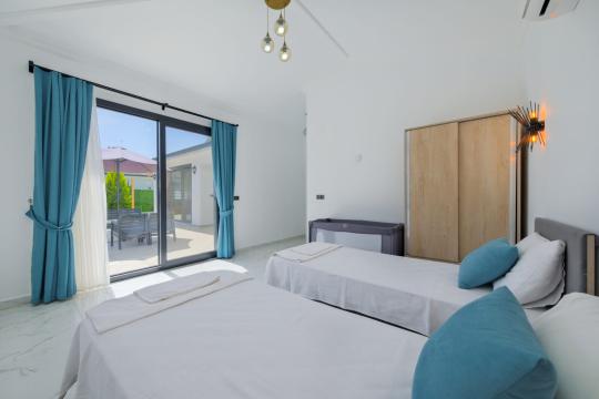 2. Yatak Odası : 2 adet tek kişilik yatak, komodin, elbise dolabı, klima, WC&banyo, havuz terasına çıkış bulunmaktadır.