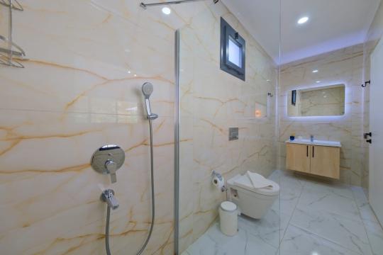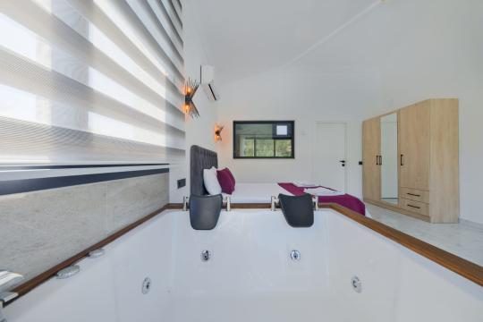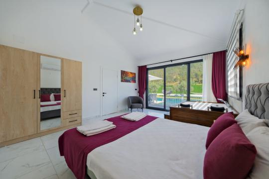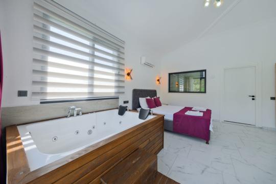1. Yatak Odası : 1 adet çift kişilik yatak, komodin, elbise dolabı, berjer, jakuzi, klima, WC&banyo, havuz terasına çıkış bulunmaktadır.