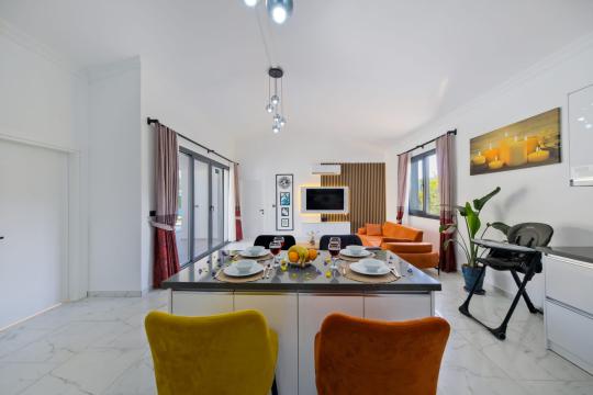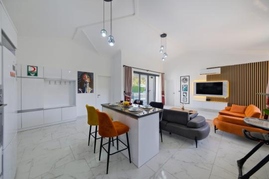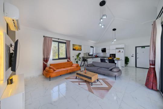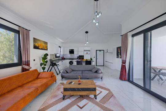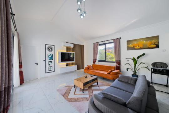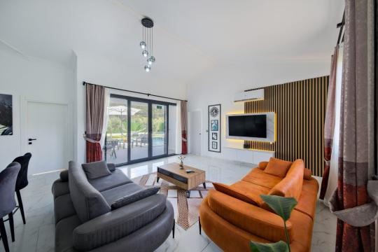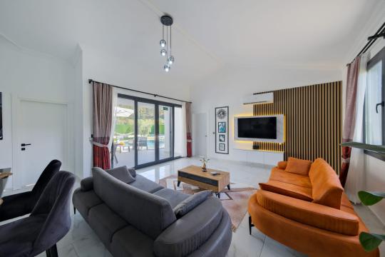 Salon : Konforlu oturma grubu, orta sehpa, TV, klima, havuz terasına çıkış bulunmaktadır.