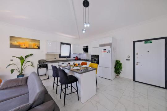 Mutfak : Amerikan ada mutfak içerinde, buzdolabı, bulaşık makinesi, çamaşır makinesi, ankastre fırın, 4’lü ocak, çaycı, tost makinesi, mutfak araç gereçleri ( tencere, tava, bardak, çatal&bıçak, yemek takımı vb.) bulunmaktadır. Havuz başına çıkış bulunmaktadır.