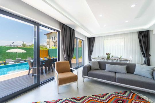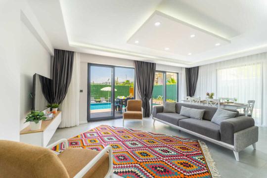 Salon : Salon içerisinde şık bir oturma grubu, berjer, TV, klima, yemek masası & sandalyeleri ve havuz terasına direkt çıkış yer almaktadır. (Ortak wc bulunmaktadır.)