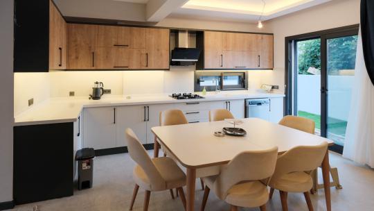 Mutfak : Havuz katında bulunan Amerikan mutfakta buzdolabı, bulaşık makinesi, çamaşır makinesi, yemek masası, fırın, 4’lü ocak, tost makinesi, kettle, yemek takımı, tava, tencereler ve çatal bıçak takımı bulunmaktadır.