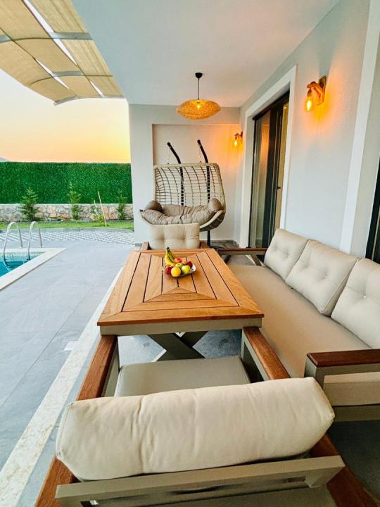 Salon: Açık mutfaklı salon, modern koltuklar, Lcd tv, uydu alıcısı ve klima bulunmaktadır. Salondan havuz ve bahçeye açılan kapısı mevcuttur.