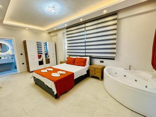 1.Yatak odası: Çift kişilik yatak, jakuzi, ebeveyn banyosu, klima, komodin, elbise dolabı ve havuz terasına çıkış kapısı bulunmaktadır.