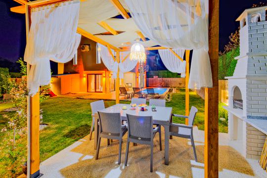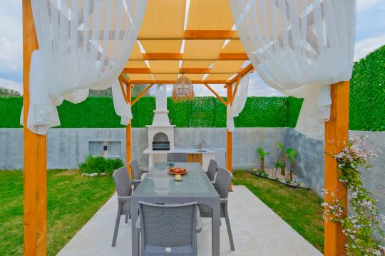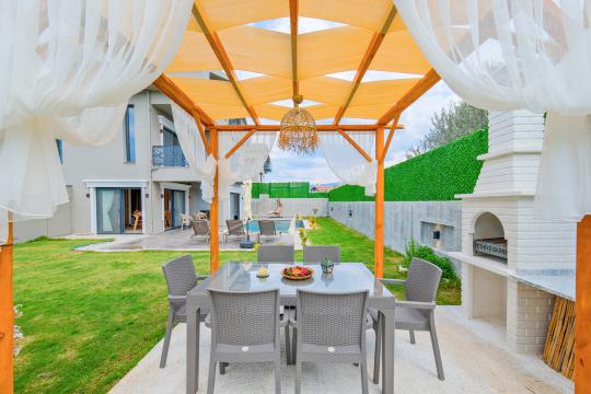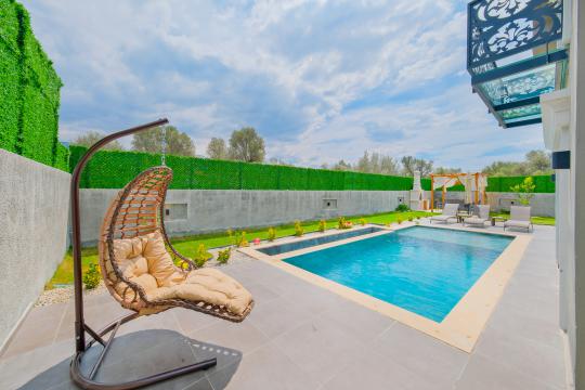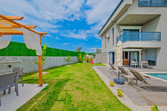 Özel yüzme havuzu, şezlong, şemsiye, bahçe mobilyaları, güneşlenme terası, kamelya, bahçe salıncağı ve çocuk oyun alanı bulunmaktadır.