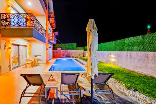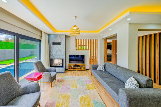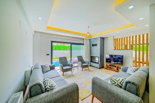 Salon: Özenle döşenmiş açık mutfaklı salon, klima, modern koltuklar, 6 kişilik yemek masası, Led tv, uydu alıcısı, havuz ve bahçeye açılan kapısı bulunmaktadır.
