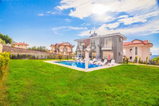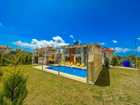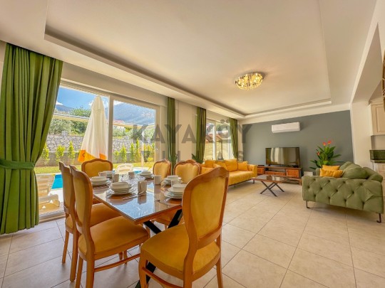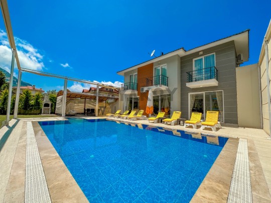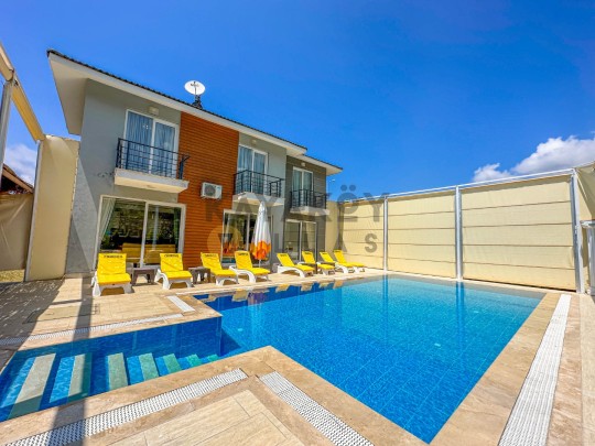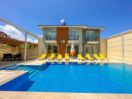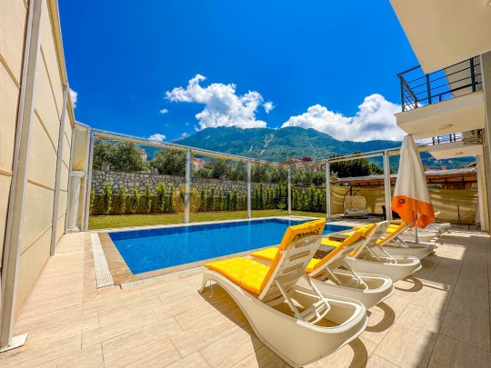 Dış mekânda ≈11,5 × 5,5 m ölçülerinde özel yüzme havuzu ile birlikte şezlonglar, güneş şemsiyeleri, barbekü/mangal alanı, veranda oturma grubu ve geniş bahçe alanı bulunur; havuz alanı korunaklı yapısıyla mahremiyet odaklı tatil fırsatı sağlar. Villa konumu Ölüdeniz Plajı’na yaklaşık 4 km mesafede olup çevredeki restoran, market ve sosyal yaşam alanlarına da kolay erişim sunar.