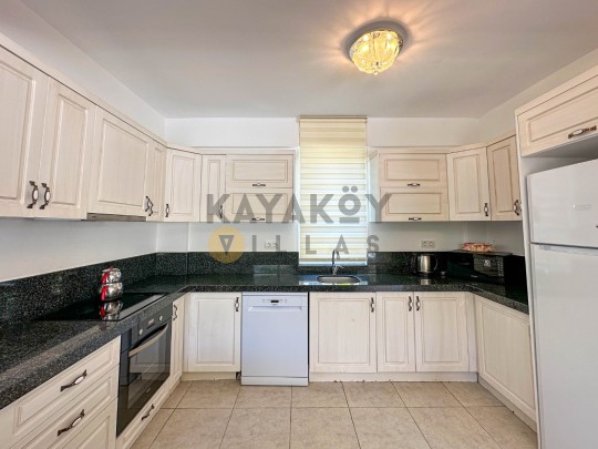 Villanın iç mekânında açık plan salon-mutfak düzeni bulunur; salon bölümünde oturma grubu, LCD TV, klima ve yemek masası gibi konfor unsurlarının yanı sıra havuz terasına direkt erişim imkânı vardır. Tam donanımlı mutfak alanı ise buzdolabı, ankastre ocak-fırın, mikrodalga, bulaşık makinesi ve gerekli mutfak gereçleri ile evinizdeki rahatlığı tatil boyunca yaşamanızı sağlar.