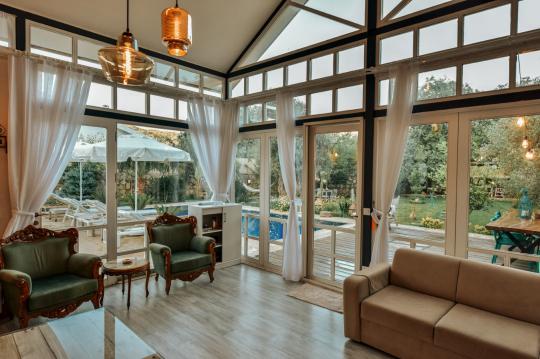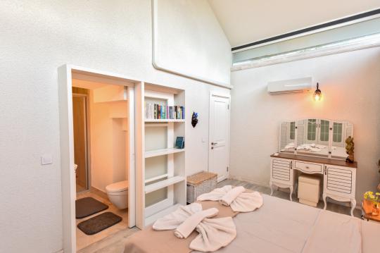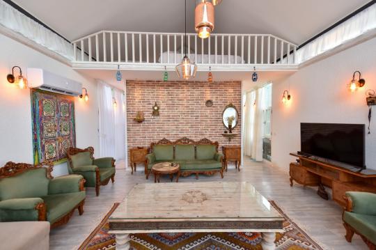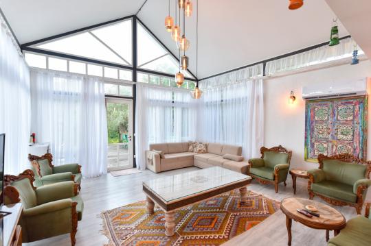 Villa Huzur, doğası ve tarihi dokusuyla yerli-yabancı binlerce turistin uğrak noktası olan Fethiye-Kayaköy’de bulunmaktadır. Villanın çeşitli objelerle hareketlendirilmiş, geniş, yemyeşil ve keyifli bir bahçesi bulunmaktadır. Bu bahçede hoş vakit geçirebileceğiniz birçok oturma köşesinin yanı sıra, tüm stresinizi atabileceğiniz ve içerisinde; çeşitli sebze ve meyvelerden oluşturulmuş bir bahçesi bulunmaktadır. Villa, iki yatak odasına sahip bir villa olup beş kişiye kadar konaklama kapasine sahiptir. Kendine özgü, içinizi ısıtacak iç tasarımıyla ön plana çıkan villamız, zevkli bir tatil geçirmek isteyen tatil severler için ideal bir seçenektir. Misafirlerin gezi turu yapabilmeleri için villada iki adet bisiklet mevcuttur.