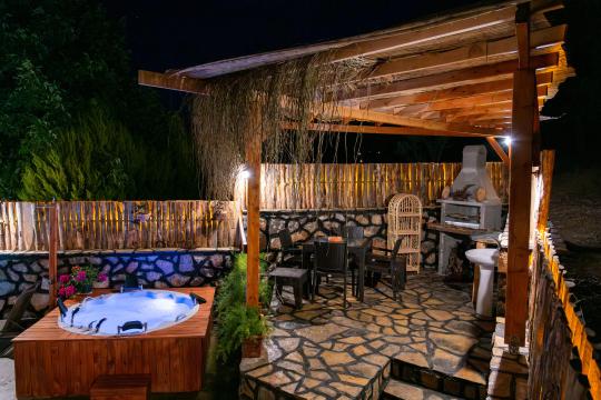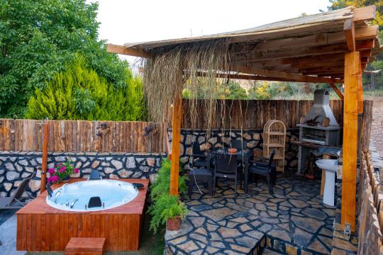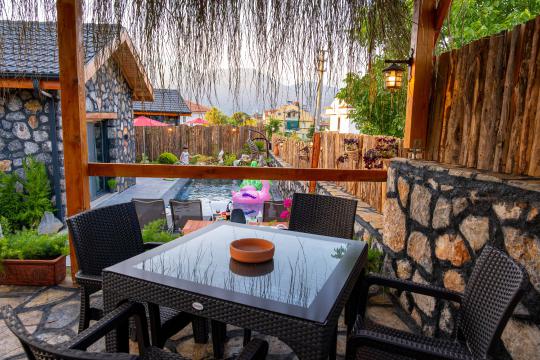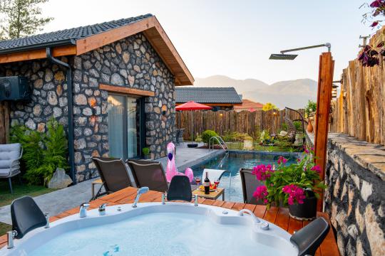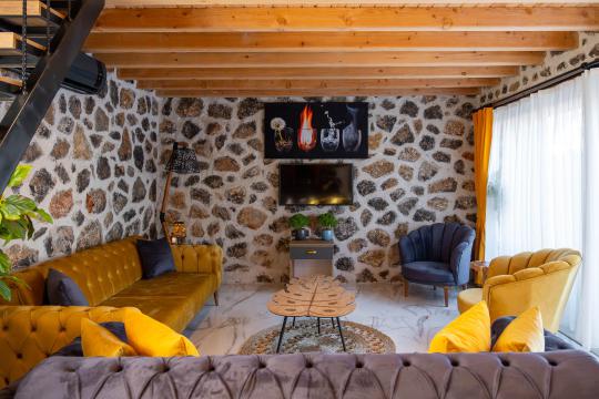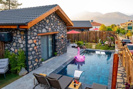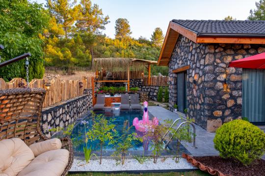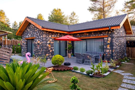 Bölgenin dokusuyla bütünleşen taş mimarinin etrafında bulunan bahçe alanına sahip villamız; misafirlerini kucaklamaya hazır olan oturma alanı, şezlong takımı ve barbekü alanı ile hayallerinizdeki tatile ev sahipliği yapacaktır.