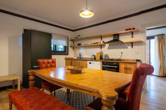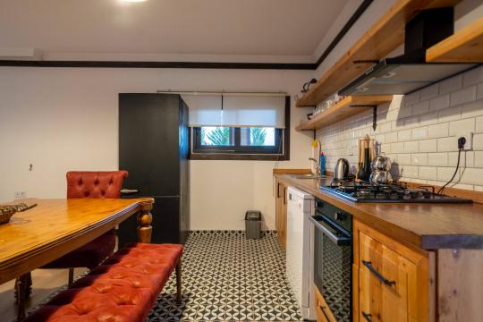 Mutfak : Havuz katında bulunan Amerikan mutfakta buzdolabı, bulaşık makinesi, çamaşır makinesi, yemek masası, fırın, 4’lü ocak, tost makinesi, kettle, yemek takımı, tava, tencereler ve çatal bıçak takımı bulunmaktadır.