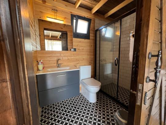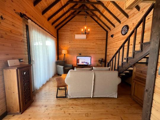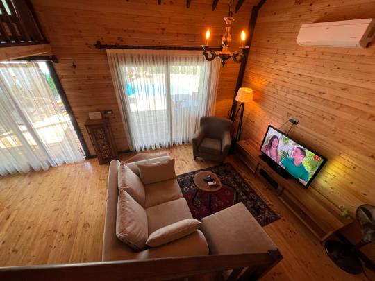 Salon : Oturma grubu, uydu alıcısı, TV, klima, lavabo, ütü, ütü masası, şömine, elektrik süpürgesi.