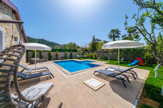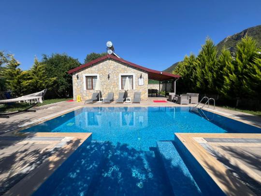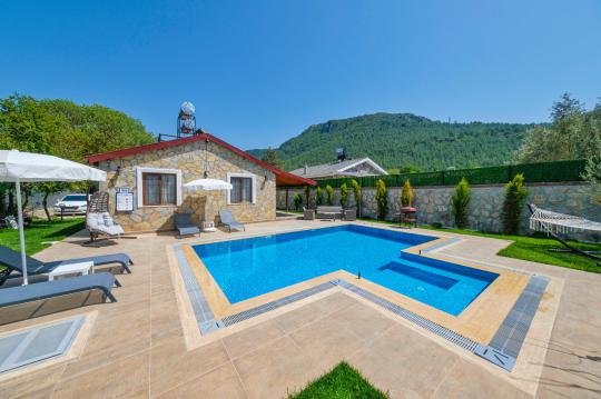 Villa Karamel şehrin gürültüsünden uzakta tatil yapmak isteyen misafirlerimize eşsiz bir tatil fırsatı sunmaktadır. Yapımı 2020 Mayıs ayında biten taş villamızın bahçe ve havuzu dışarıdan görünmeyecek şekilde korunaklıdır. Villamızda 2 adet yatak odası ve 1 adet banyo olup 4 kişilik konaklama kapasitesine sahiptir. Doğal ve tarihi ortamıyla misafirlerini büyüleyen Kayaköy, Fethiye şehir merkezine ve dünyaca ünlü Ölüdeniz Plajı’na yalnızca 10 dakika mesafededir. Villamız çekirdek aileler ve balayı çiftleri için uygundur. Geniş ve özel yüzme havuzu ile misafirlerimize kusursuz bir tatil imkanı sunmaktadır. Villamızın bulunduğu bölge itibariyle yaz akşamlarının bunaltıcı sıcaklarında bile daha serin bir tatil ortamı sizi bekliyor.