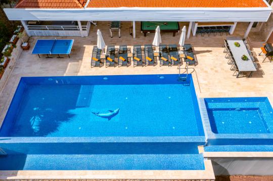 Bahçe: Villa bahçesinde havuz,barbekü,şezlong,şemsiye,bar ve yemek masası bulunmaktadır.