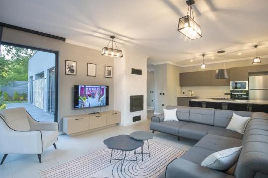 Salon: Rahat şık oturma grubu , LCD TV, w-fi, uydu alıcısı, şömine , klima, ütü ve ütü masası bulunmaktadır.