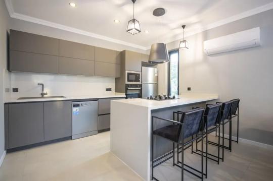 Mutfak : Amerikan mutfaktır.Mutfak barı ve sandalye, buzdolabı, bulaşık makinesi, çamaşır makinesi 4’lü ocak, ankastre fırın, çatal ve bıçak takımı, tost makinesi , türk kahve makinesi, mikrodalga , elektrikli su ısıtıcı ( kettle ), tencere ve tavalar, 4 kişilik yemek takımı, su ve çay bardakları yer almaktadır.