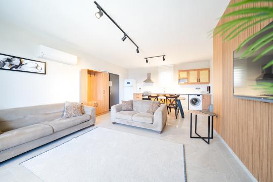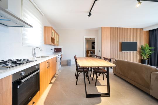 Modern Yaşam Alanı: Klimalı salon ve tam donanımlı mutfak ile ev konforu.