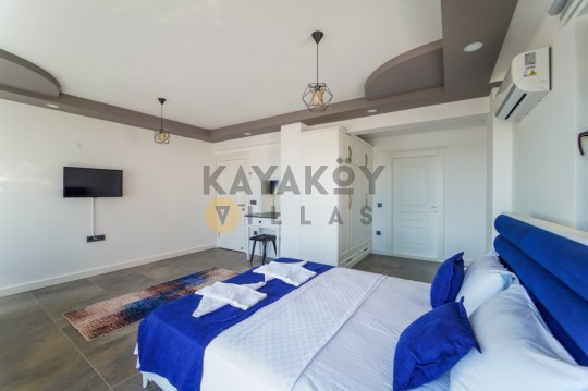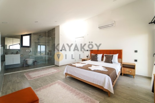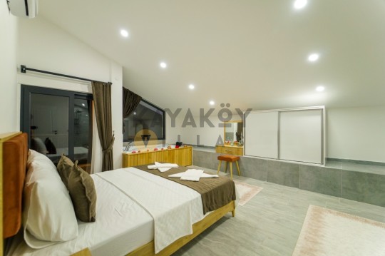 Villanın iç mekânında dört adet yatak odası bulunur: üç odada çift kişilik yatak, klima, ebeveyn banyosu ve jakuzili banyo yer alırken dördüncü yatak odasında iki tek kişilik yatak, klima ve banyo mevcuttur. Salon alanı modern mobilyalarla döşenmiş olup TV, klima ve doğrudan havuz terası erişimi gibi özelliklerle tatil boyunca konforlu bir yaşam alanı sunar. Açık plan mutfakta buzdolabı, mikrodalga fırın, ankastre ocak-fırın, tost makinesi, bulaşık makinesi ve temel mutfak ekipmanları yer alır; bu sayede ev konforunda yemek hazırlama imkânı sağlar.