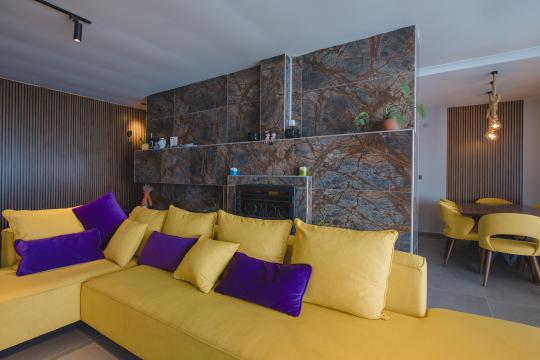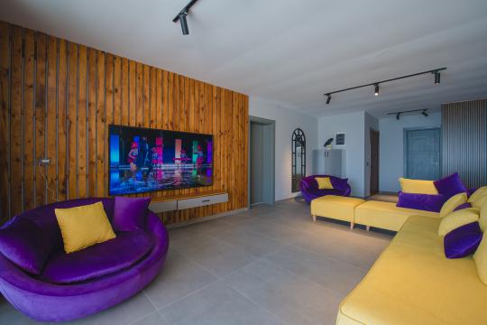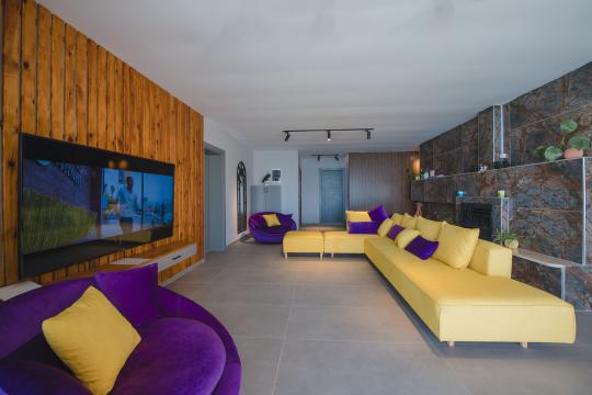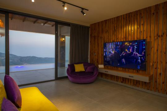 Salon : Oturma grubu, uydu alıcısı, TV, klima, lavabo, ütü, ütü masası, şömine, elektrik süpürgesi.