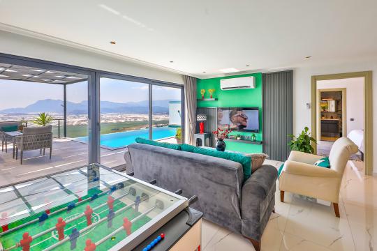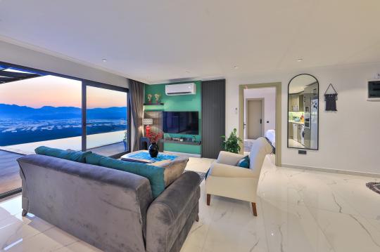 Salon; Oturma grubu, televizyon, klima, sehpa, langırt, havuz terasına çıkış bulunmaktadır.