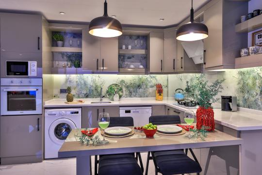 Mutfak; Amerikan mutfak, buzdolabı, bulaşık makinesi, çamaşır makinesi, fırın, 4’lü Ocak (ankastre), elektrikli su ısıtıcı, tava, tencere vb. mutfak ekipmanları, yemek masası, yemek takımı bulunmaktadır.