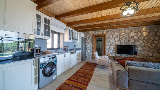 Mutfak : Havuz katında bulunan Amerikan mutfakta buzdolabı, bulaşık makinesi, çamaşır makinesi, yemek masası, fırın, 4’lü ocak, tost makinesi, kettle, yemek takımı, tava, tencereler ve çatal bıçak takımı bulunmaktadır.
