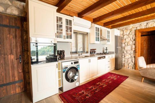 Mutfak : Havuz katında bulunan Amerikan mutfakta buzdolabı, bulaşık makinesi, çamaşır makinesi, yemek masası, fırın, 4’lü ocak, tost makinesi, kettle, yemek takımı, tava, tencereler ve çatal bıçak takımı bulunmaktadır.