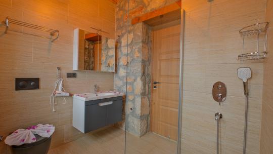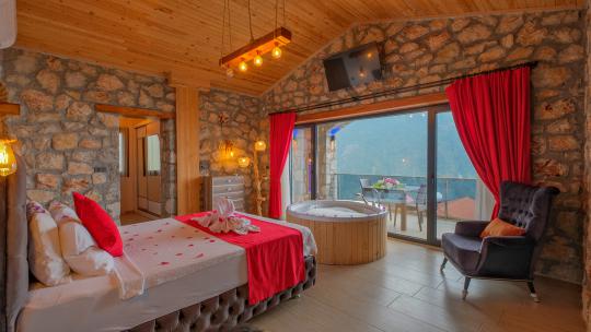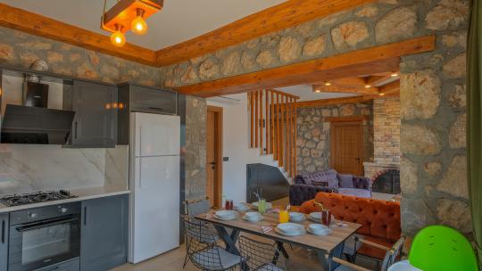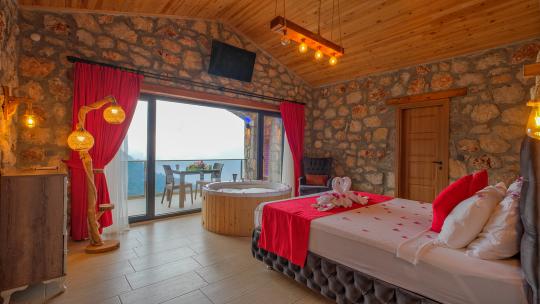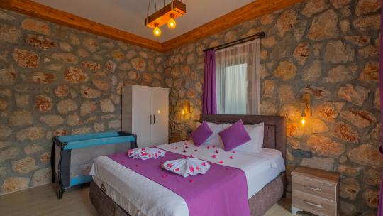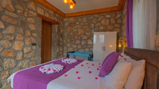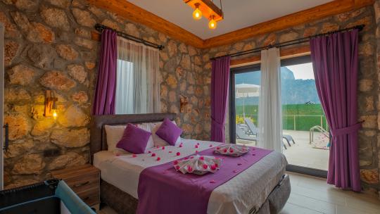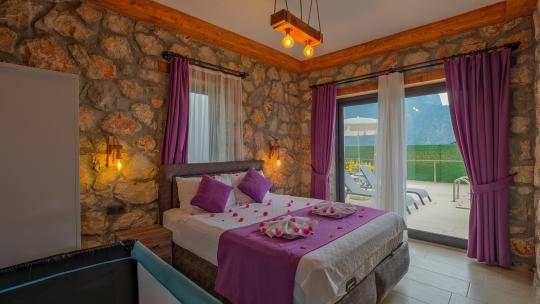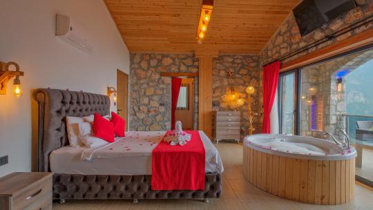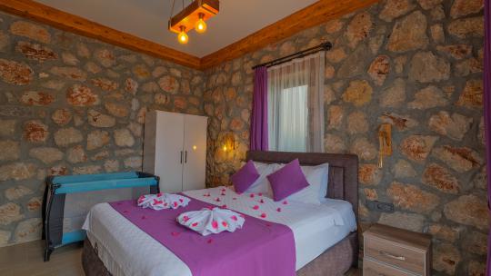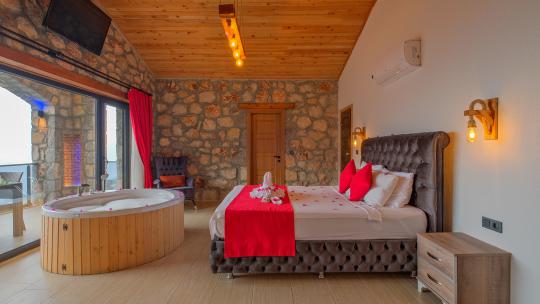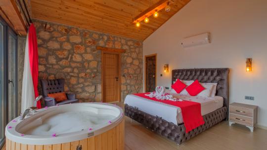 Villamız maksimum 4 kişi konaklama kapasitesine sahiptir. Toplamda 2 yatak odası ve salon mutfak bulunmaktadır. Birinci yatak odasında çift kişilik yatak, jakuzi, sauna, klima ve WC -Duş bulunmaktadır. İkinci yatak odasında bir tane çift kişilik yatak ve klima bulunmaktadır. Ortak alanda, şık bir salon-mutfak, , TV, WC- Duş ve klima mevcuttur.