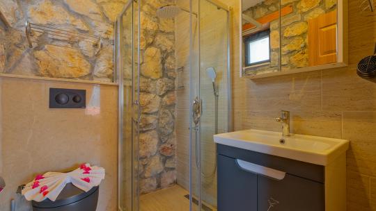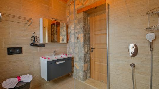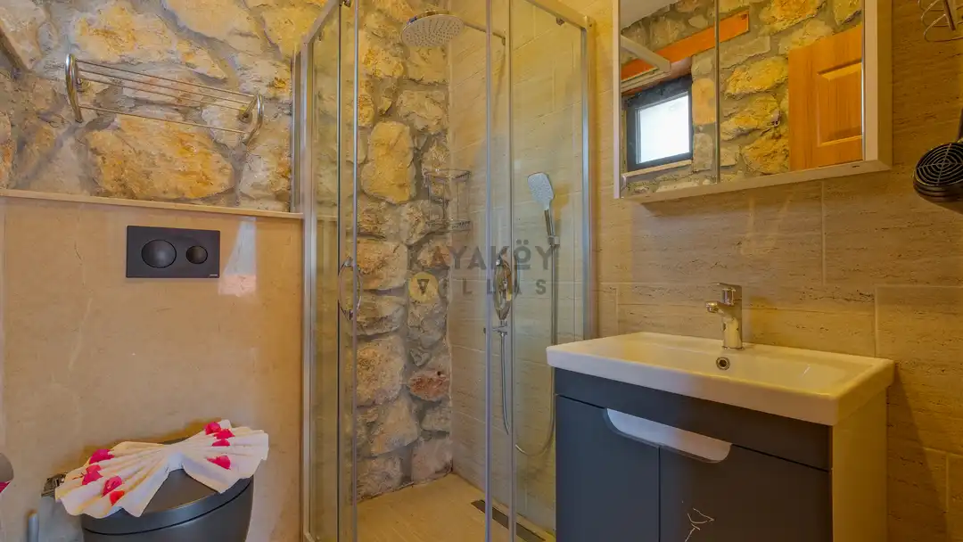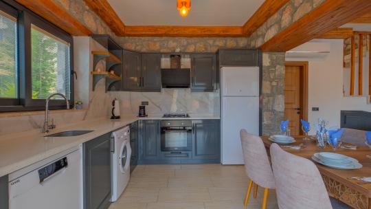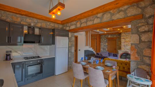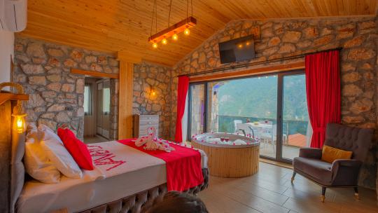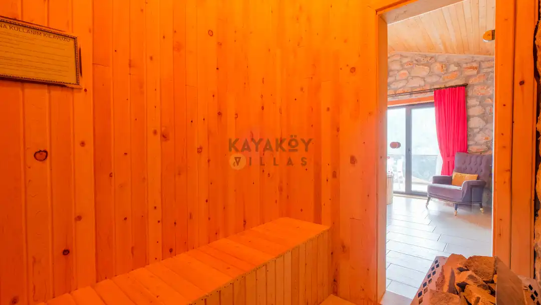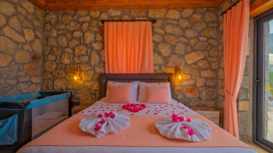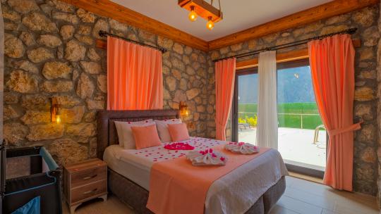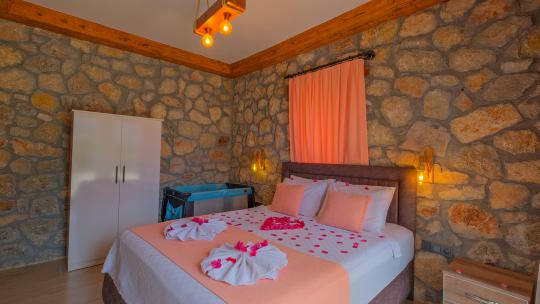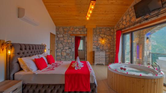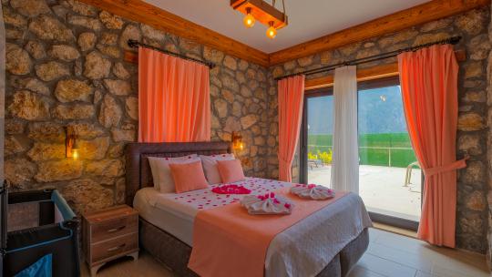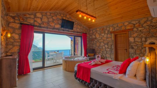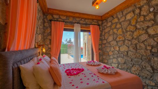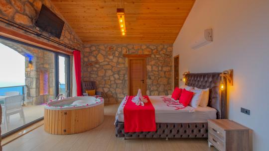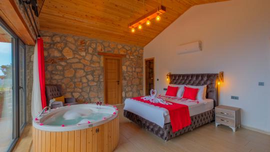 Villamız maksimum 4 kişi konaklama kapasitesine sahiptir. Toplamda 2 yatak odası ve salon mutfak bulunmaktadır. Birinci yatak odasında çift kişilik yatak, jakuzi, sauna, klima ve WC -Duş bulunmaktadır. İkinci yatak odasında bir tane çift kişilik yatak ve klima bulunmaktadır. Ortak alanda, şık bir salon-mutfak, , TV, WC- Duş ve klima mevcuttur.