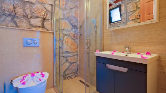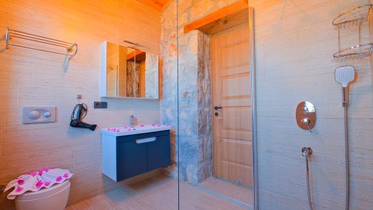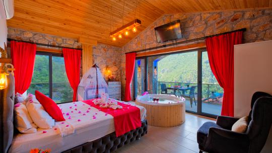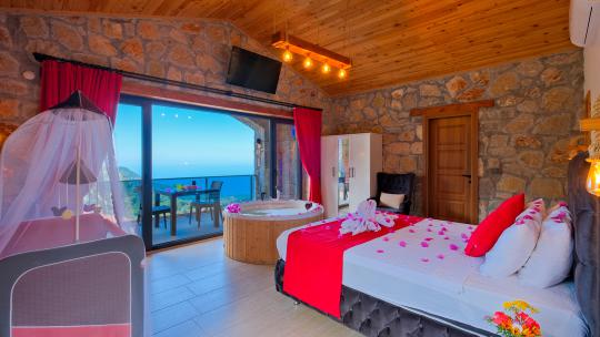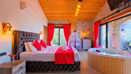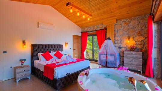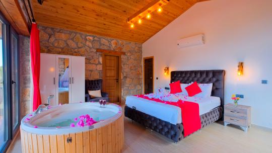 Villamız maksimum 2 kişi konaklama kapasitesine sahiptir. Toplamda 1 yatak odası ve salon mutfak bulunmaktadır. Birinci yatak odasında çift kişilik yatak, ,klima ve WC + jakuzi, sauna bulunmaktadır. Ortak alanda, şık bir salon-mutfak, , televizyon, WC -Duş ve klima mevcuttur.