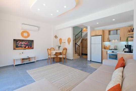 Salon : Zemin Katta (Havuz ve Doğa manzaralı), Oturma grubu, Uydu TV, 4 kişilik yemek masası, Klima, Havuz terasına çıkış bulunmaktadır.