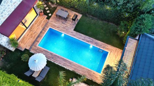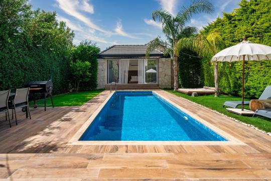 1 Nisan - 15 Mayıs / 1 Ekim - 30 Kasım arası ücretsiz olan dış havuz ısıtmalı villamızda ortalama su sıcaklığı 27 derece civarındadır.