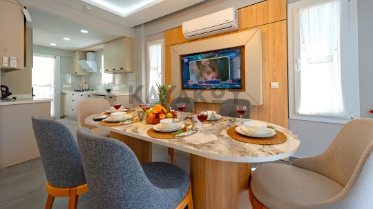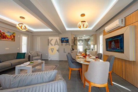Açık plan salon ve mutfak alanı modern mobilyalarla döşenmiştir. Salon bölümünde oturma grubu, yemek masası, televizyon ve klima bulunurken mutfak kısmında buzdolabı, bulaşık makinesi, ankastre fırın, mikrodalga fırın, tost makinesi ve günlük pişirme ekipmanları gibi tüm gerekli donanımlar mevcuttur. Salon doğrudan havuz terasına açılır ve tatil boyunca iç/dış mekân akışını kolaylaştırır.