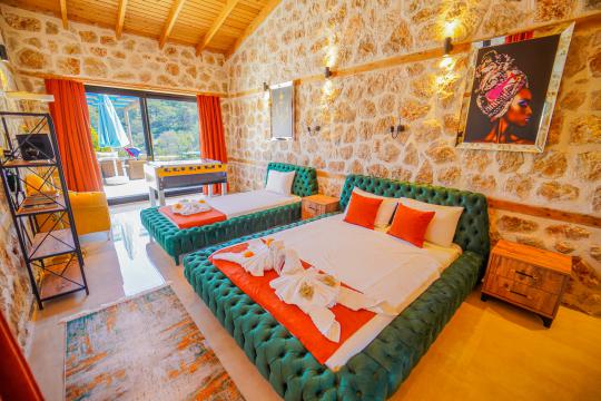 2.Yatak Odası: 1 adet çift kişilik yatak, 1 adet tek kişilik yatak, klima, elbise dolabı, komodin, makyaj masası, banyo, tuvalet, havuz terasına çıkış bulunmaktadır.