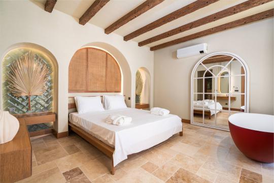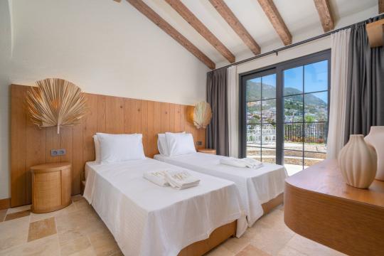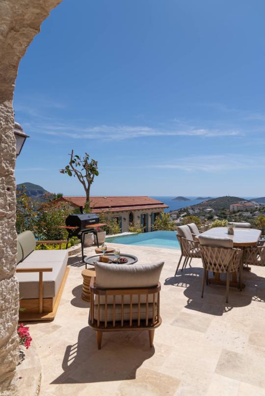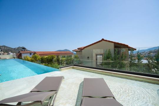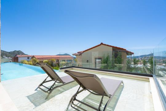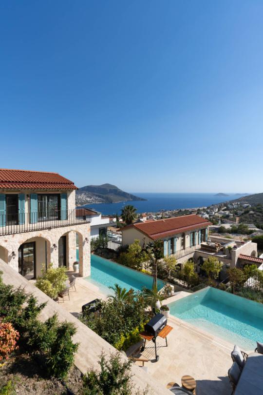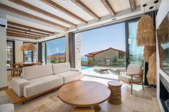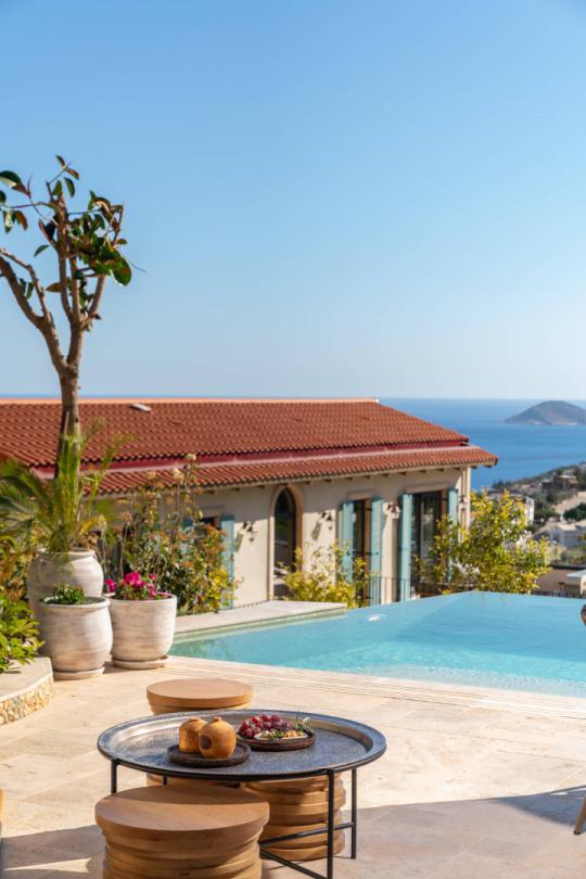 Eşsiz deniz manzarası bulunan, şık tasarıma sahip villa bünyesinde kapasiteye uygun mobilyalar, ihtiyacınız olan tüm araç-gereçleri barındıran Amerikan tarzda, modern mutfak ve 3 adet yatak odası mevcuttur. Konforunuz odaklı tasarlanan villanın tüm yatak odalarında klima ve özel kullanım banyo bulunmaktadır. Ebeveyn suit yatak odasında günün yorgunluğunu atmanızı ve tatilin keyfini çıkarmanızı sağlayacak 1 adet jakuzisi de bulunmaktadır. Villanın deniz manzarası gören havuz terasında kapasiteye uygun şezlong ve şemsiye, oturma alanı, yemek masası ve barbekü alanı bulunmaktadır.