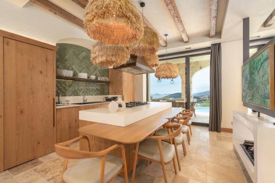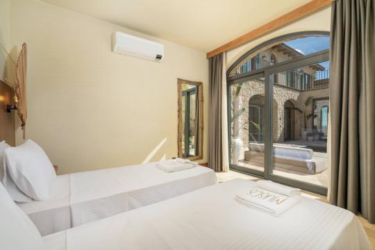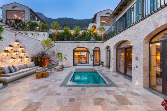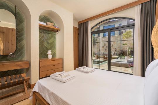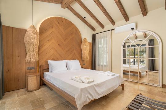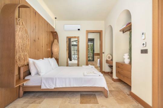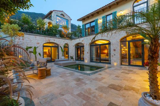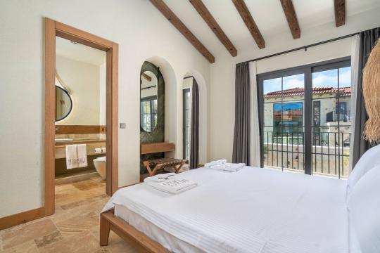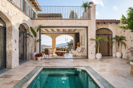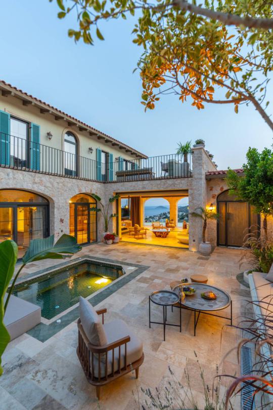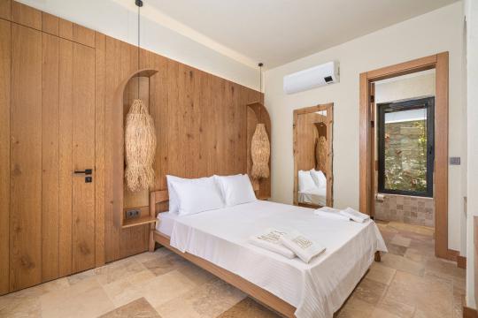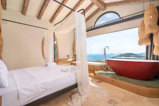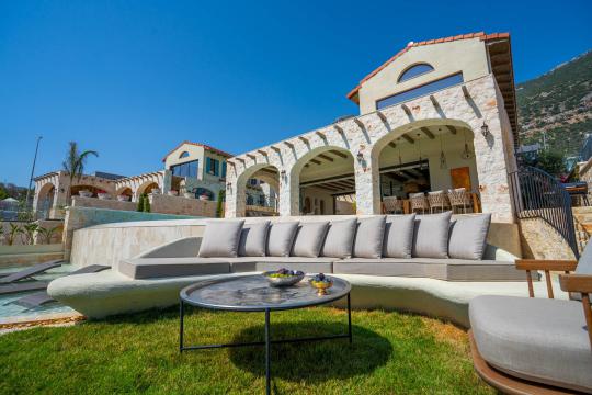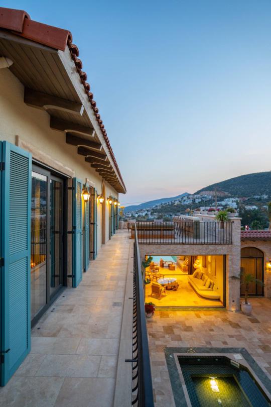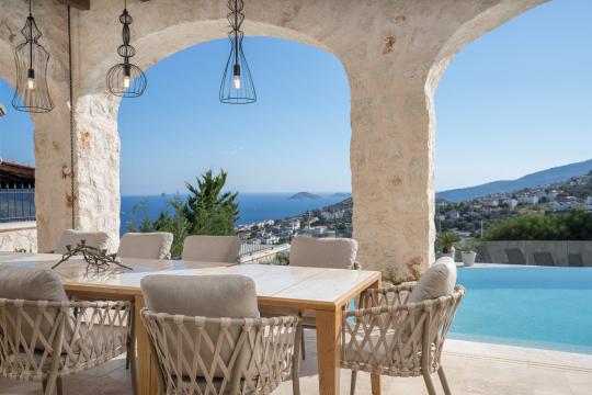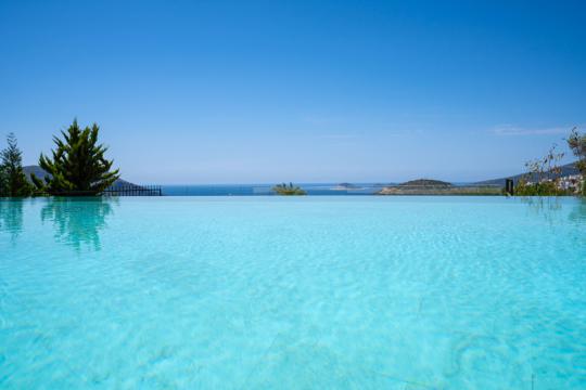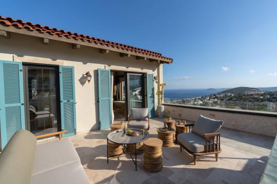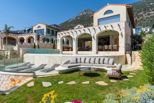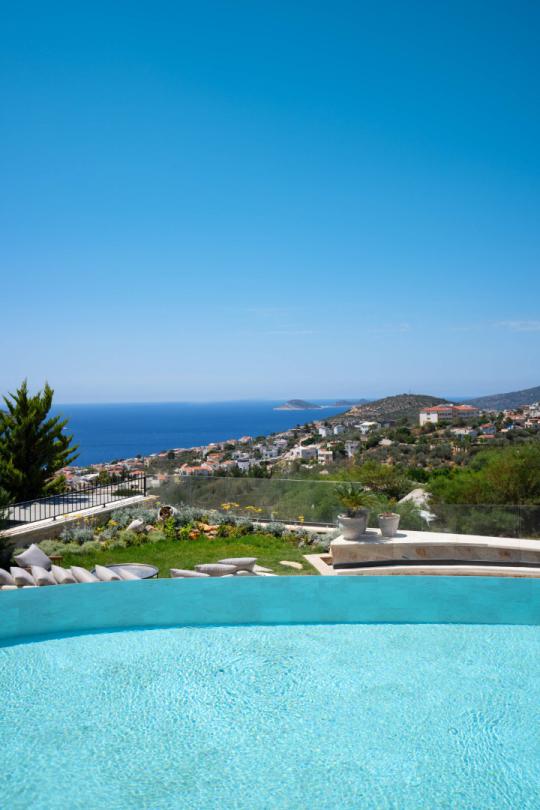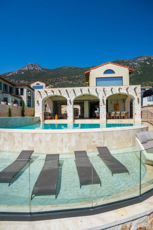 Eşsiz deniz manzarası bulunan, şık tasarıma sahip villa bünyesinde kapasiteye uygun lüks mobilyalar, ihtiyacınız olan tüm araç-gereçleri barındıran Amerikan tarzda, modern mutfak ve 5 adet yatak odası mevcuttur. Konforunuz odaklı tasarlanan villanın tüm yatak odalarında klima ve özel kullanım banyo bulunmaktadır. Ebeveyn suit yatak odasında günün yorgunluğunu atmanızı ve tatilin keyfini çıkarmanızı sağlayacak 1 adet jakuzisi de bulunmaktadır. Villanın deniz manzarası gören havuz terasında kapasiteye uygun şezlong ve şemsiye, oturma alanı, yemek masası ve barbekü alanı bulunmaktadır.