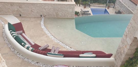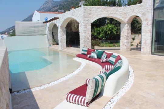 Eşsiz deniz manzarası bulunan, şık tasarıma sahip villa bünyesinde kapasiteye uygun lüks mobilyalar, ihtiyacınız olan tüm araç-gereçleri barındıran Amerikan tarzda, modern mutfak ve 5 adet yatak odası mevcuttur. Konforunuz odaklı tasarlanan villanın tüm yatak odalarında klima ve özel kullanım banyo bulunmaktadır. Ebeveyn suit yatak odasında günün yorgunluğunu atmanızı ve tatilin keyfini çıkarmanızı sağlayacak 1 adet jakuzisi de bulunmaktadır. Villanın deniz manzarası gören havuz terasında kapasiteye uygun şezlong ve şemsiye, oturma alanı, yemek masası ve barbekü alanı bulunmaktadır.