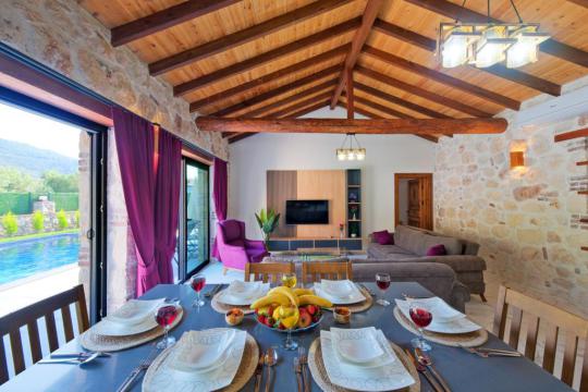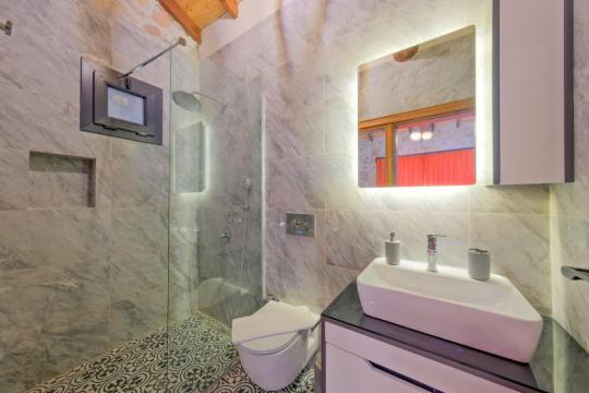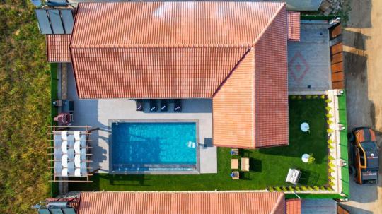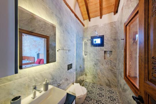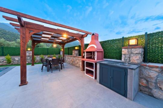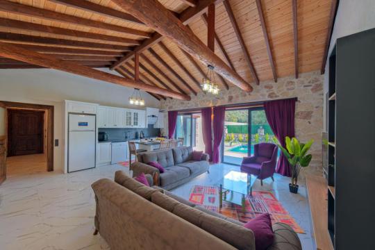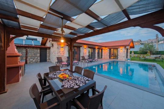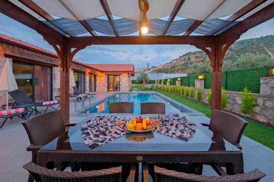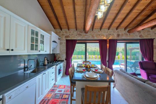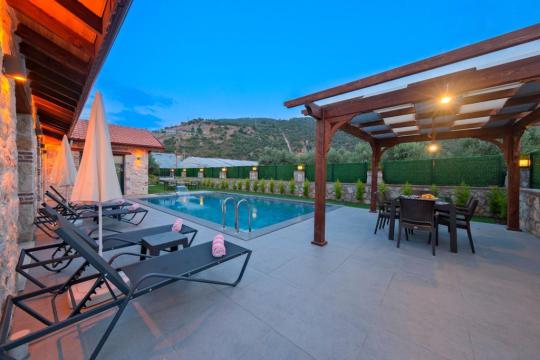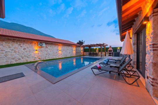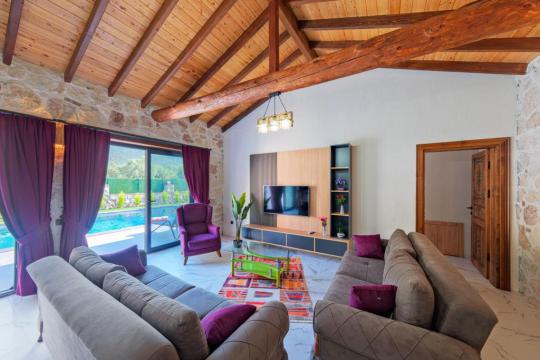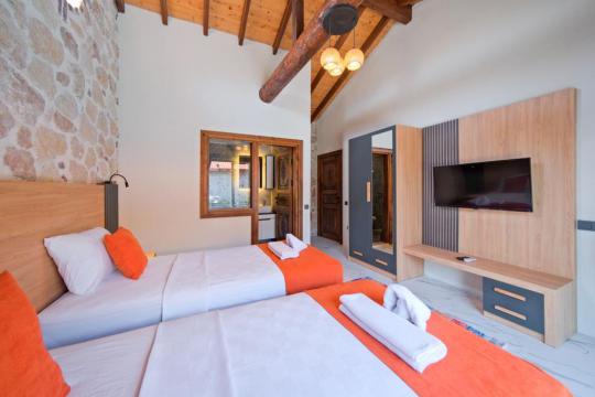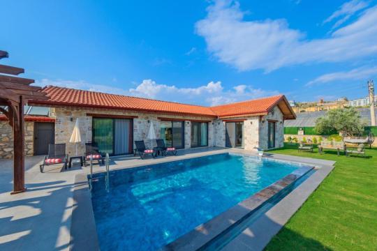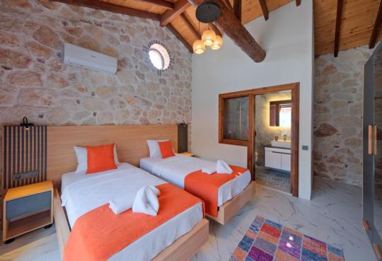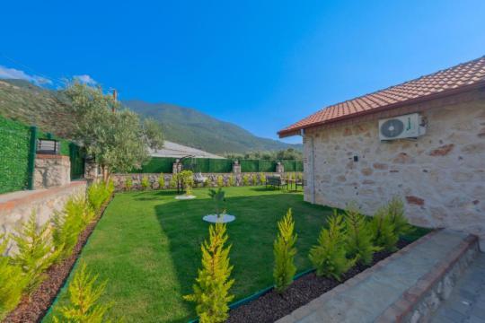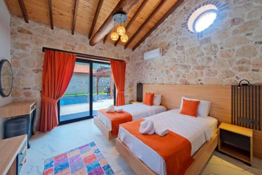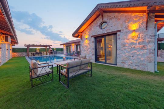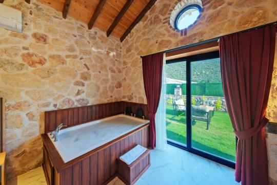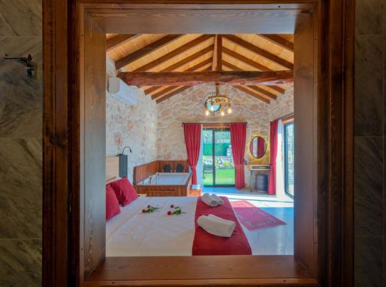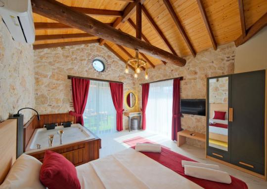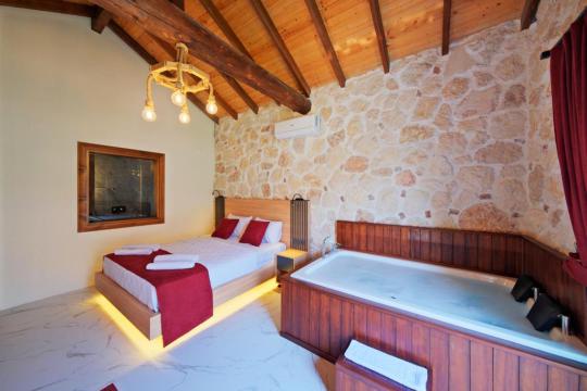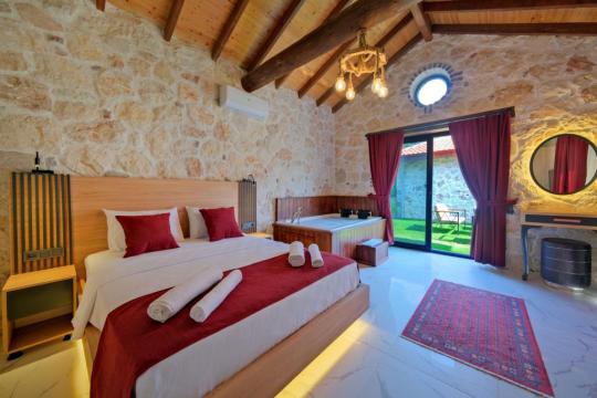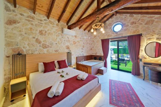 Muhtemeşem bir doğa manzarasına nazır konumu, geniş havuz ve bahçe alanıyla daha ilk andan itibaren huzurlu ve konforlu bir tatil geçireceğinizi hissedeceğiniz villamızın iç mekanı da oldukça ferah bir yapıya sahiptir. Taş mimariden oluşan villamızın her iki yatak odası da ebeveyn banyosuna sahip olmakla birlikte ebeveyn odasında geniş ve kullanışlı bir jakuzi de konumlandırılmıştır.
