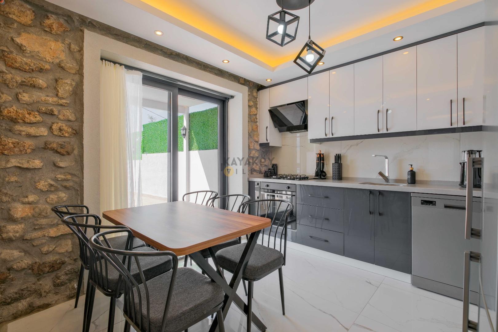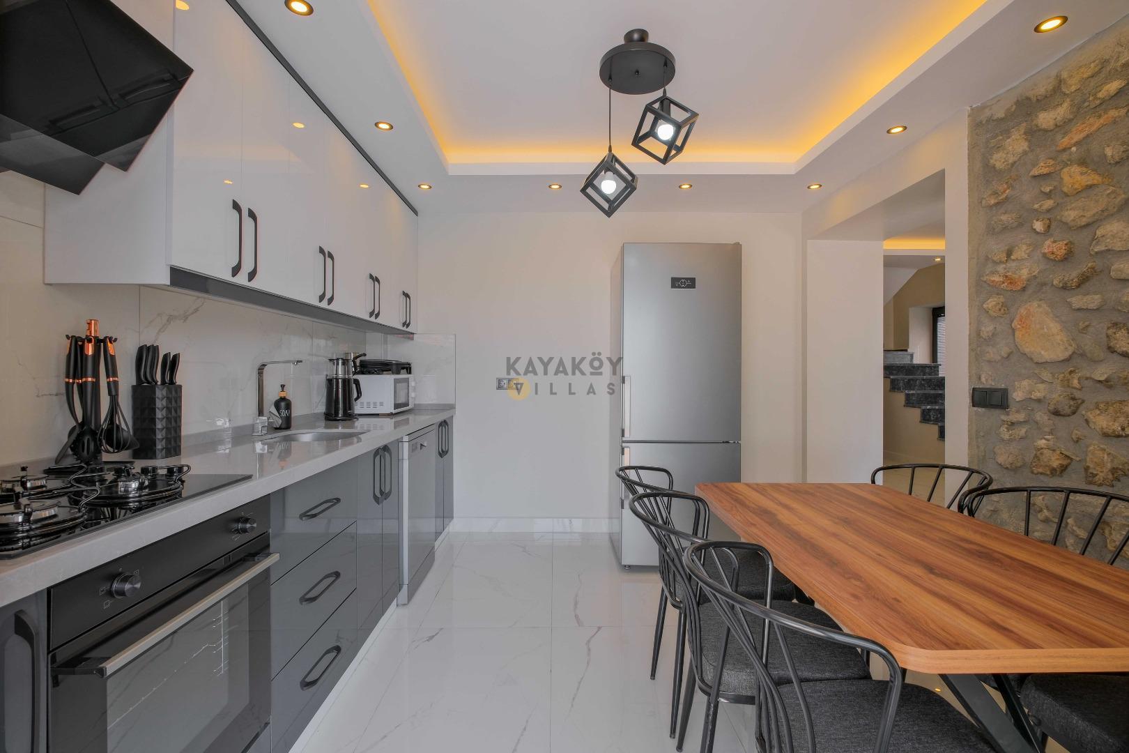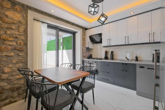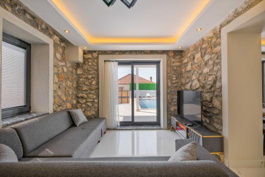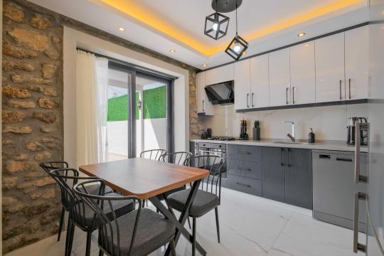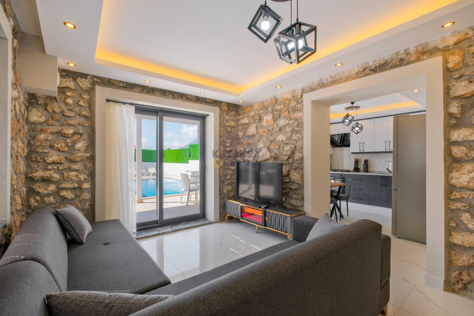 Açık plan salon ve mutfak alanı modern mobilyalarla döşenmiştir; salon bölümünde klima, televizyon, geniş oturma grubu ve yemek masası yer alırken mutfakta mikrodalga fırın, fırınlı ocak, bulaşık makinesi ve temel pişirme ekipmanları gibi tam donanımlar bulunur. Salon doğrudan havuz terasına açılır ve tatil boyunca iç/dış mekân akışını kolaylaştırır.