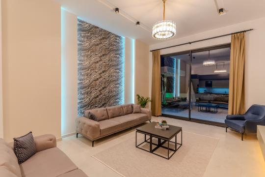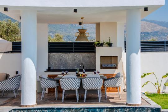 Modern oturma grubu, şemsiye, şezlong, salıncak, mangal, duş, yemek masası ve sandalyesi bulunmaktadır.