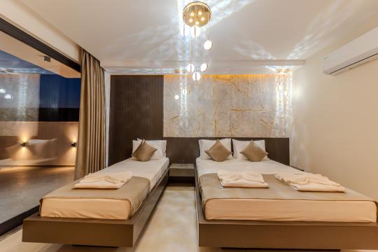 2. Yatak Odası:1 adet çift kişilik, 1 adet tek kişilik yatak, makyaj masası, televizyon, klima, jakuzi, elbise dolabı, komodin, tuvalet ve banyo bulunmaktadır.
